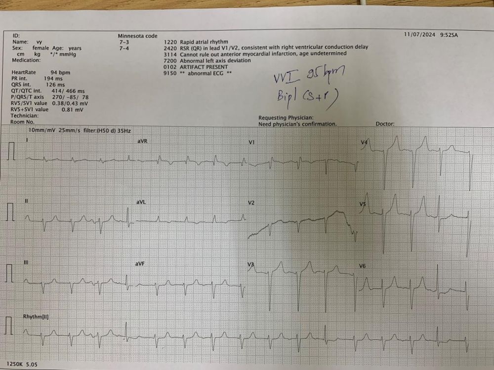 Trường hợp lâm sàng: Bệnh nhân nam 71 tuổi vào viện vì chóng mặt, có nhiều lần bị ngất trong vòng 2 tháng nay, tiền sử: Tăng huyết áp. Bệnh nhân có điện tâm đồ, kèm Holter ECG phát hiện có nhiều khoảng ngừng, có khoảng >5 giây. Bệnh nhân được tiến hành đặt tạo nhịp 2 buồng có đáp ứng tần số, vùng thất được đặt chọn lọc vào bó nhánh trái.