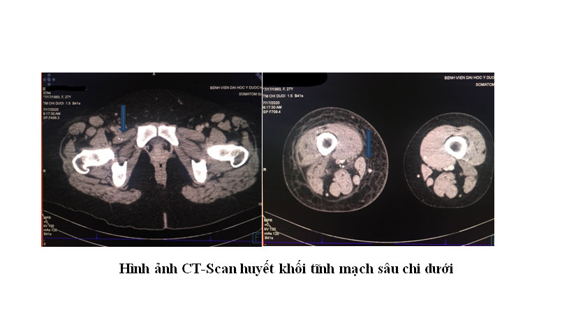 Bệnh nhân được cho nhập viện sau vài ngày và làm thêm các xét nghiệm nhưng chưa thấy rối loạn tăng đông máu. Nhận thấy đây là một bệnh nhân có nguy cơ cao với huyết khối tĩnh mạch sâu nên ekip điều trị đã sử dụng Enoxaparin (Thuốc chống đông máu Heparin trọng lượng phân tử thấp) để dự phòng huyết khối trong khi chờ thực hiện CT-Scan hệ tĩnh mạch chi dưới. Kết quả CT-Scan phù hợp với biểu hiện lâm sàng của bệnh nhân: Huyết khối tĩnh mạch sâu từ vùng cẳng chân phải lan lên tĩnh mạch chậu ngoài và chậu chung phải.